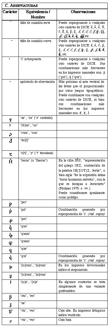 (C) AbreviaturasEstas grafías pasaron directamente desde los usos del amanuense a las cajas de composición, para ir abandonándose luego paulatinamente, a medida que se perdía el reverente respeto al módulo formal del manuscrito y se asumían por entero las posibilidades de reproducción múltiple, veloz y barata que la imprenta traía consigo (cf. por ejemplo Febvre y Martin 1962). Son muy frecuentes sin embargo durante los siglos XV-XVI y perviven todavía en tiempos posteriores, singularmente en textos latinos y en impresos devocionales (tabla 3).