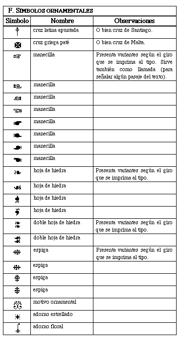 (F) Símbolos ornamentalesSe trata de un heterogéneo conjunto de tipos (tabla 6), muy frecuentes en las producciones bibliográficas clásicas. Aunque su finalidad sea esencialmente ornamental, en ocasiones comportan también alguna función informativa, caso de la manecilla, que permitía destacar determinados fragmentos textuales.